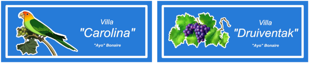 Cada villa se identifica con una placa azul en la parte delantera. Para Villa Carolina, elegimos una imagen del colorido periquito de Carolina, mientras que Villa Druiventak está representada por una elegante rama de vid.